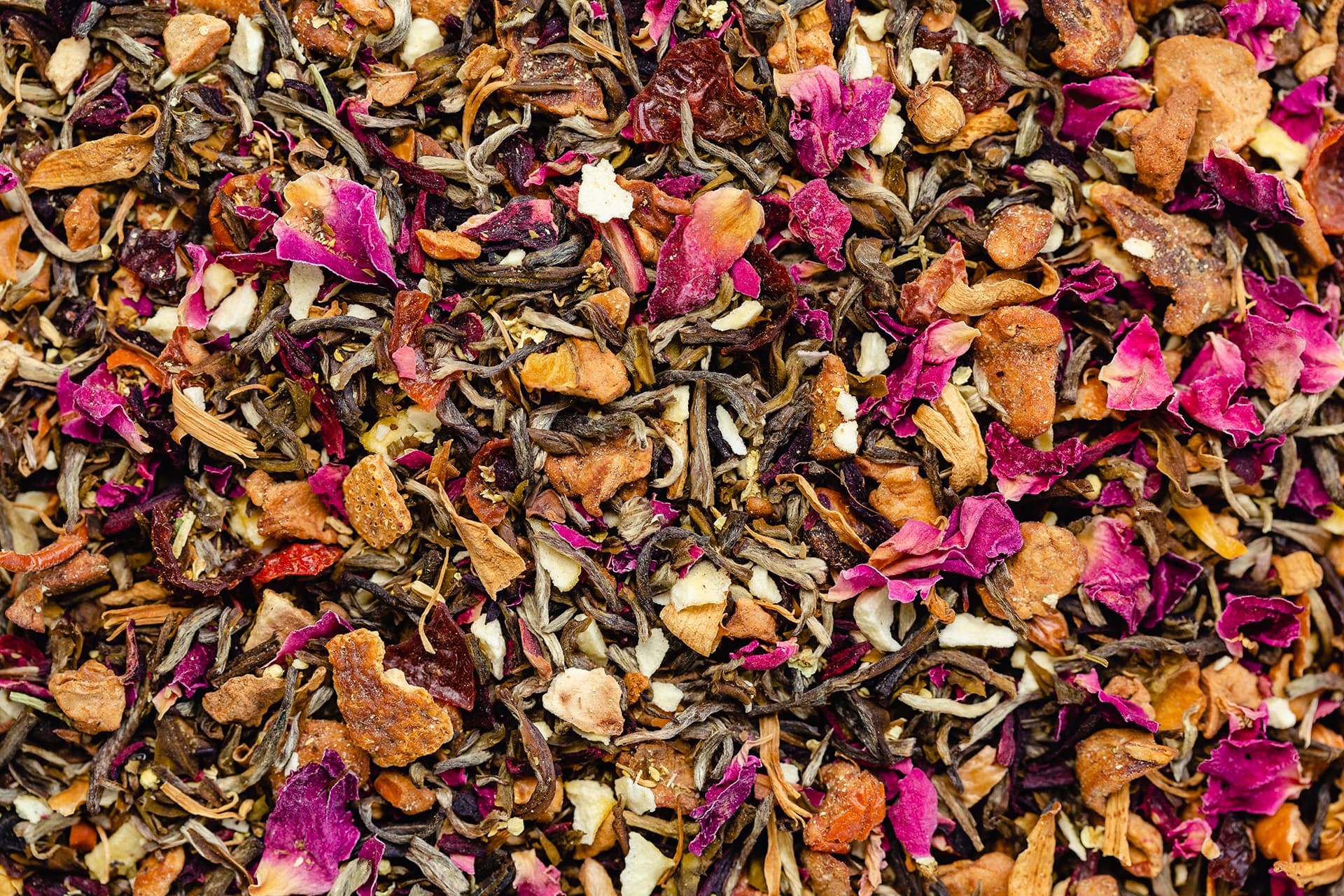 Ingredients: Chinese White Tea, Apple Pieces, Rosehip, Hibiscus, Orange Peel, Freeze-dried Passionfruit (5%), Elderflower, Orange Blossom, Rose Petals, Natural Flavouring. Contains Caffeine.